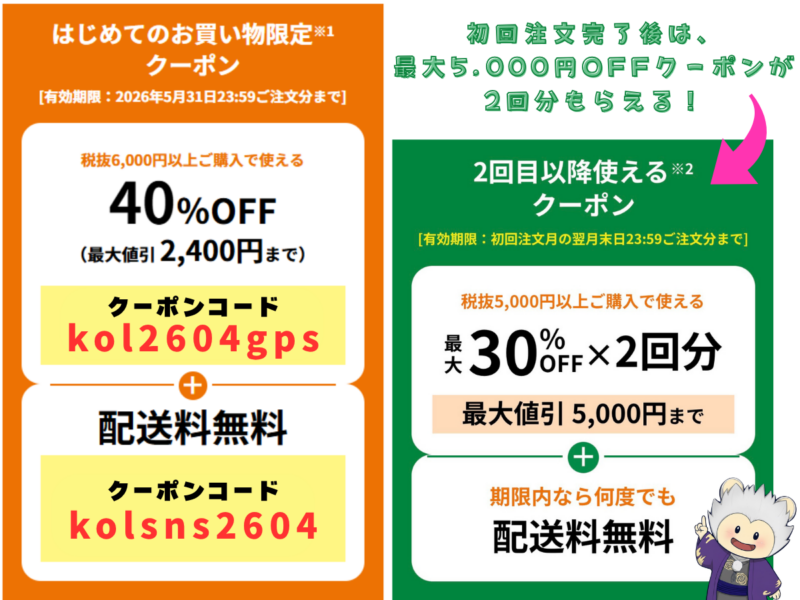 初めて利用する方は、初回クーポンを使うとさらにお得に買い物できるのでぜひ活用してね!