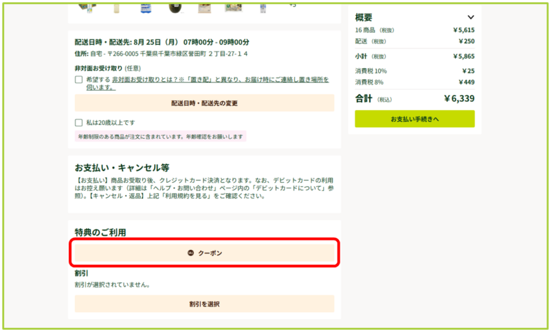 クーポンコードの入力は「ご注文内容の確認」画面の下にある「特典のご利用」のクーポン欄に入力します。