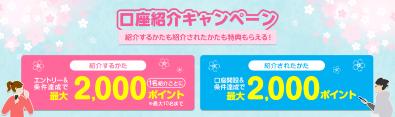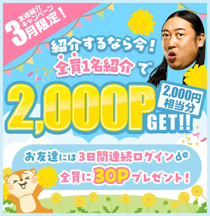 さらに3月は上記特典に加え、友達を1名紹介すると2,000ポイントGET!