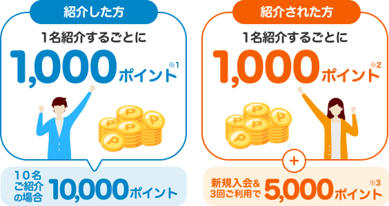 紹介コードもしくは紹介用URL経由で会員登録し、5,000ポイント以上貯めると追加で2,000ポイントもらえます。